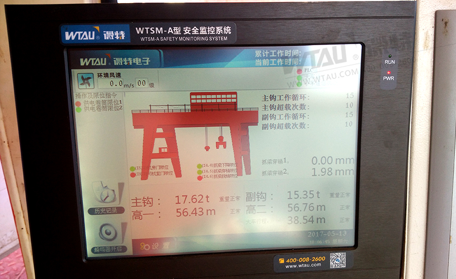 微特安全監控系統,對門機運行工況進行實時采集,實時記錄。進行數據核算比對,顯示畫面比傳統儀表更直觀、更友好。在門機運行接近限定值、規定值,系統將對司機做出提醒,在到達限定值時將警告司機,并停止司機的危險操作。
