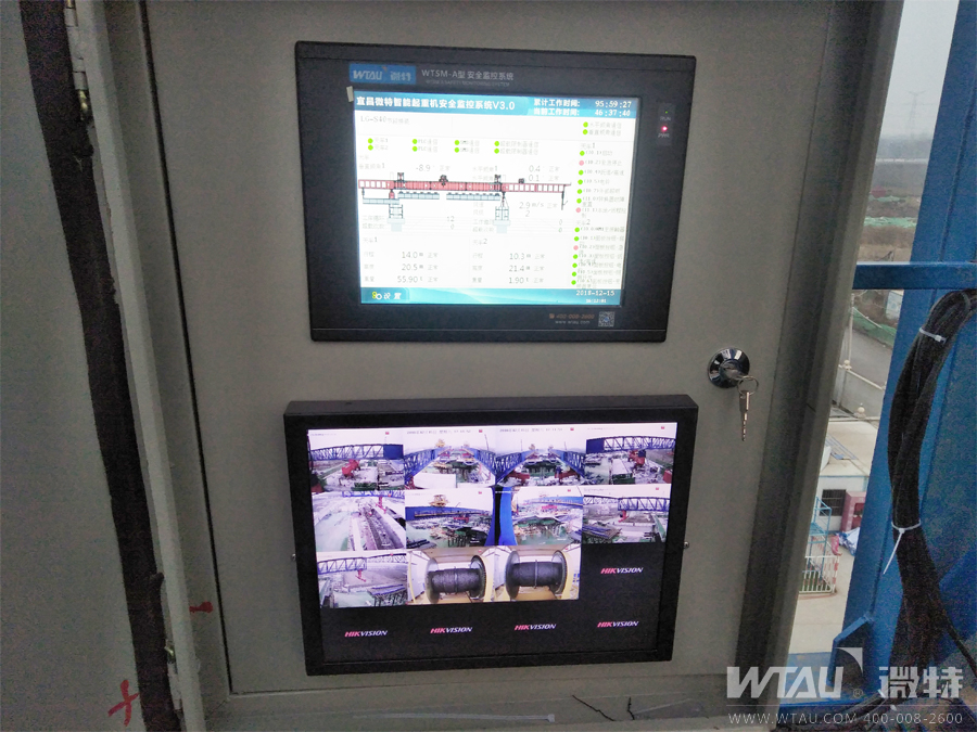 此次施工現(xiàn)場為鄭州四環(huán)繞城高架,由于工期緊張,微特技術(shù)售后安裝人員在架橋機拼裝尾期就來到了現(xiàn)場與聯(lián)東技術(shù)人員做技術(shù)交流。配裝的WTMS-A安全監(jiān)控系統(tǒng)滿足國家標準對大型吊裝設(shè)備安全監(jiān)控的要求,具有常用的通訊接口,有獨立并可擴展的I/O功能。整機數(shù)據(jù)采用Modbus或Profibus通訊,對起重設(shè)備具有實時監(jiān)控、動態(tài)顯示、聲光顯示、數(shù)據(jù)備份以及密碼保護等功能,且該系統(tǒng)自身具有抗干擾性強,操作界面好,通用性強等優(yōu)點。通過一周的安裝調(diào)試,微特WTSM-A安全監(jiān)控系統(tǒng)通過特檢單位驗收并獲得用戶好評。