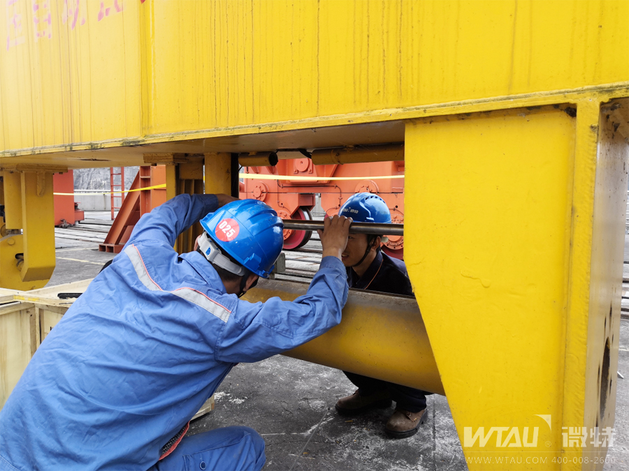 微特的技術工程師正在對向家壩電廠右岸進水口3200KN門機液壓抓梁加裝水下穿銷傳感器