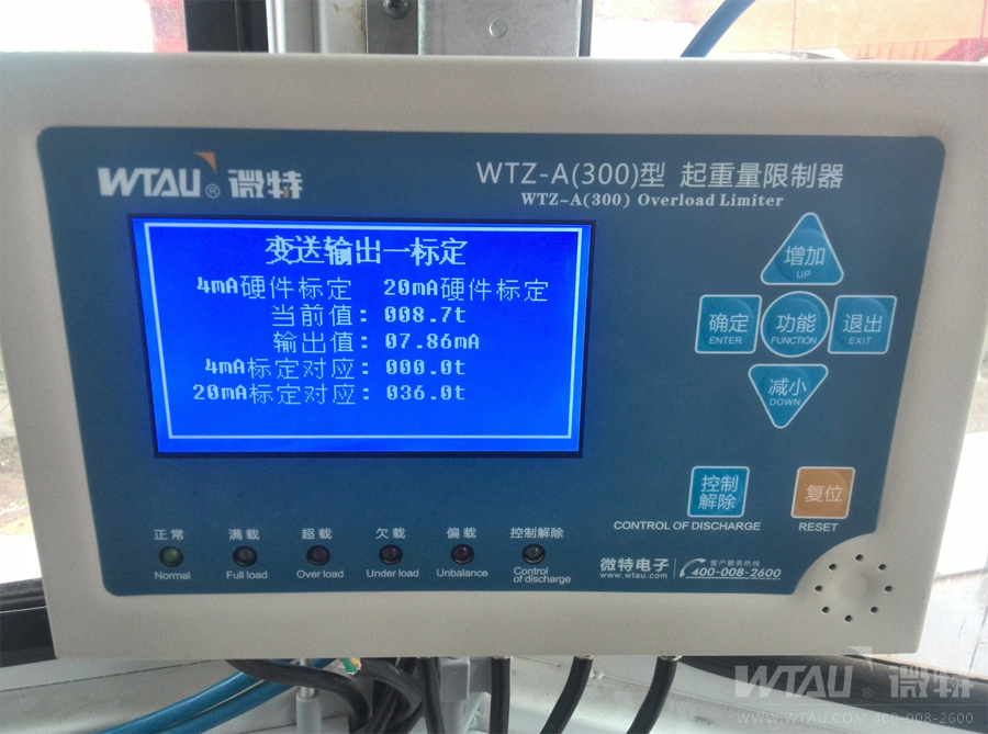 WTZ-A300起重量限制器界面除實際重量顯示外,還有載荷率百分比棒狀圖顯示。菜單表格清楚明了,非常利于調試及校正;采用民用220VAC和工業380VAC兩種規格電源輸入,現場的適應能力強。