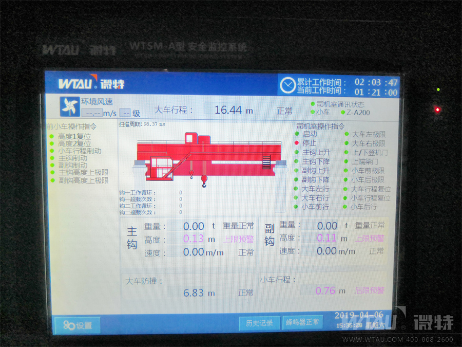 微特WTSM-A型起重機安全監控系統具有實時監控,動態顯示,聲光報警,數據存儲,斷電記憶以及密碼保護等功能,且儀表本身設計具有抗干擾性強,操作界面方面,通用性強等優點。經過微特技術工程師的現場安裝調試完后順利通過了客戶及當地特檢機構的驗收,贏得了客戶的認可,也為我們今后在淄博地區業務的深入開展起到了一個良好的開端。