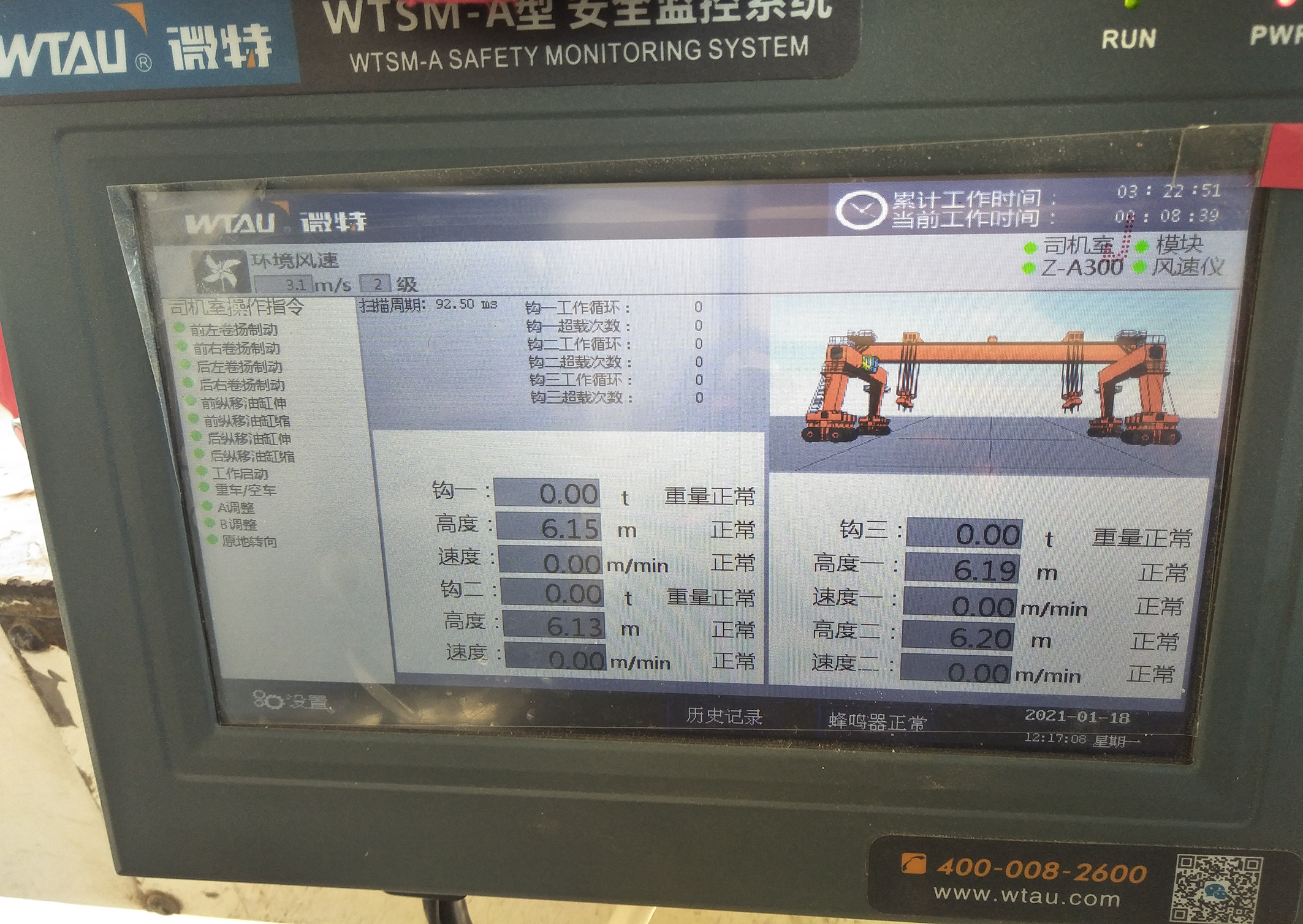 微特研發的提梁機安全監控系統對設備的運行數據進行實時監控,該儀表可以顯示提梁機的起升高度、起重量、速度、大車行程、小車行程、同軌道防碰撞、風速、工作次數、超載次數等相關數據實時顯示,并對相關數據進行分析判斷,防止設備向不安全區域運行。當往不安全區域運行時,該系統首先會預警,并發出聲光報警提醒操作人員,并根據實際情況啟動控制功能,使設備相關運行機構停止運行,以起到保護作用。