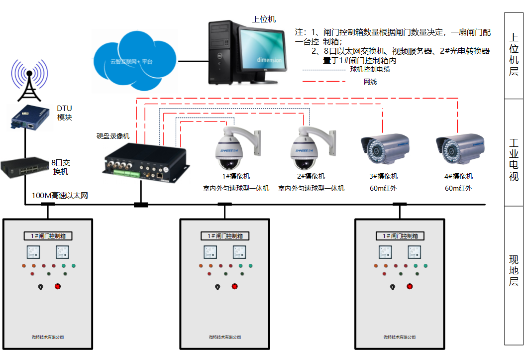由微特為小云峰水電站提供的技術解決方案,全系統采用7套閘門現地操作箱和4套可編程控制單元及相關配套通信設施,采用可編程控制器控制方式設計。現地控制單元完成對閘門的數據采集及數據預處理,負責通過網絡傳送數據信息,并自動服從上位機的命令和管理。