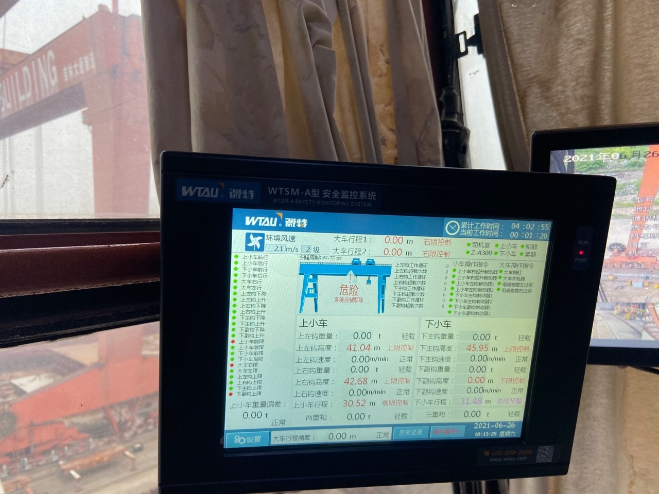 此次微特與泰州三福船舶公司合作項目為WTSM-A型龍門吊安全監控管理系統,采集了司機室下位機,小車下位機及監視門機各個動作及運行參數,以及重量、小車行程各限位和操作指令狀態。各狀態指示燈在顯示紅燈時代表門機對應機構已動作,綠燈代表對應機構無動作,各重量行程及速度會在屏上顯示出對應的數據。