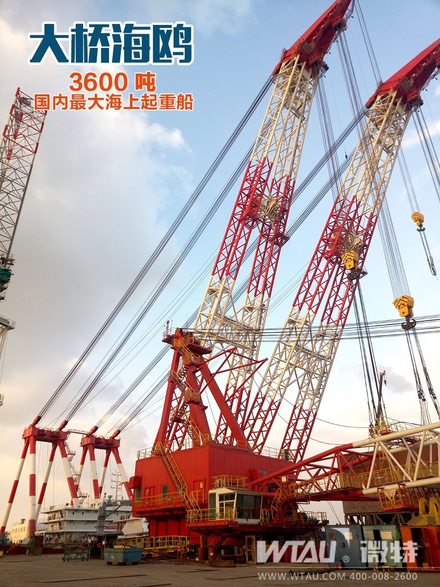 “大橋海鷗”3600T起重船為中國自主研發設計制造,平潭海峽大橋80米和88米鋼桁梁的整孔吊裝架設,需要起重量3200噸以上、吊高110米的起重船。為滿足平潭海峽公鐵兩用大橋整孔鋼梁架設及大型構件的海上吊裝需要,2015年初,中鐵大橋局投資3.4億元設計建造了這艘3600噸起重船。它是中鐵大橋局“走向海洋”戰略實施的重要裝備支撐。