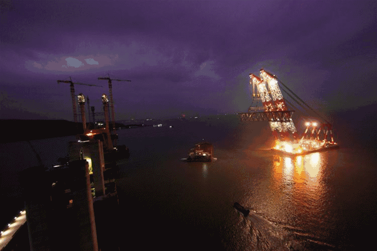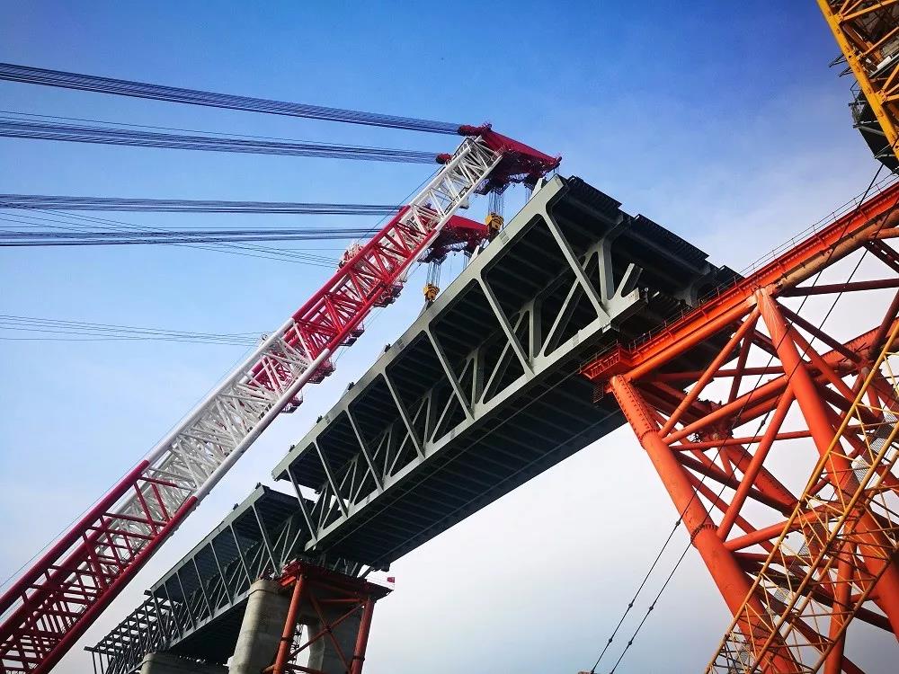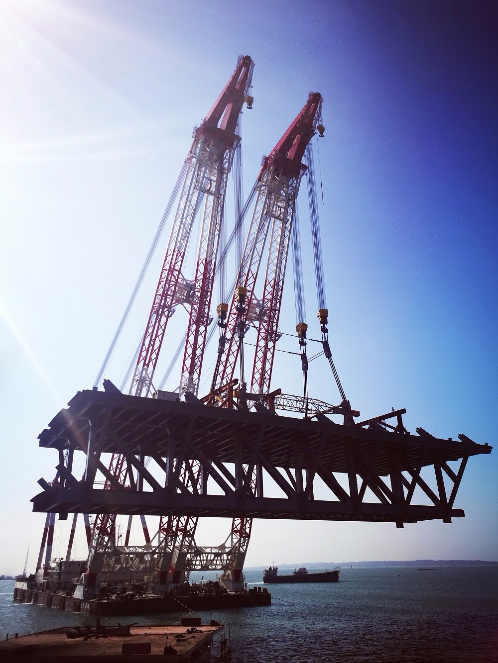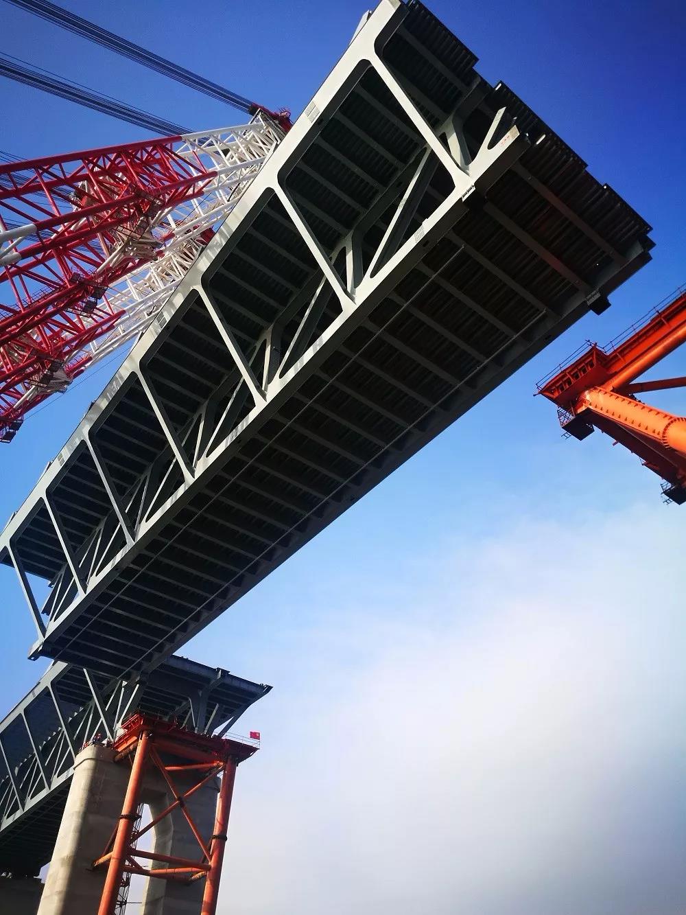 為克服惡劣自然環境,大橋施工采取鋼桁梁整孔全焊接制造,在工廠整體制造總拼,然后裝船從江蘇如皋歷經約1000公里海上運輸至橋位處,現場海上浮吊整孔架設,為國內首創,填補了我國斜拉橋大節段鋼桁梁整孔吊裝架設的技術空白。本次吊裝的超級鋼桁梁長96.25米,寬36.8米,相當于8個籃球場;高15.35米,相當于5層樓;設計重量達3150噸,加上吊具起吊重量近3400噸,相當于2260輛小汽車的重量。