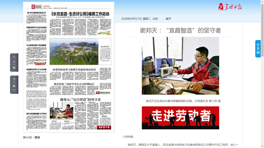 2018年4月17日,三峽日報與三峽宜昌網(wǎng)同步發(fā)布了題為“走進勞動者|謝邦天:“宜昌智造”的堅守者”的專訪文章,贊揚了微特研發(fā)工程師堅守崗位,默默耕耘,為“宜昌智造”貢獻力量。