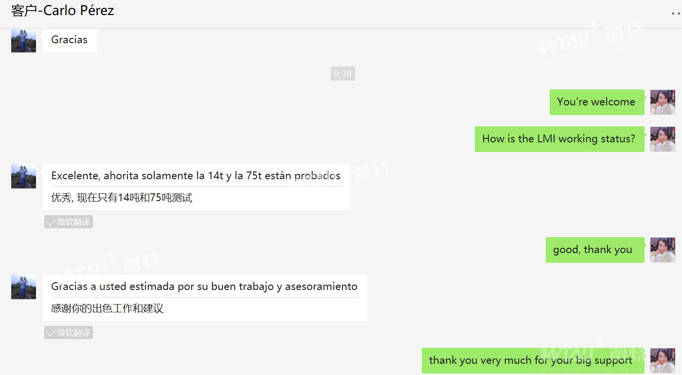 微特外貿經理Riki收到來自中美洲尼加拉瓜客戶CARLO對微特力矩限制器產品的反饋, 并發來部分客戶自己安裝調試的產品圖片及吊車現場工作圖片。此次合作,微特協助客戶在14T隨車吊上安裝了WTL-A200力矩限制器以及在75T汽車吊安裝了WTL-A700型力矩限制器。 跟蹤產品使用狀態時,客戶給出了非常滿意的答復并對微特外貿經理的合理選型及溝通建議表示感謝!