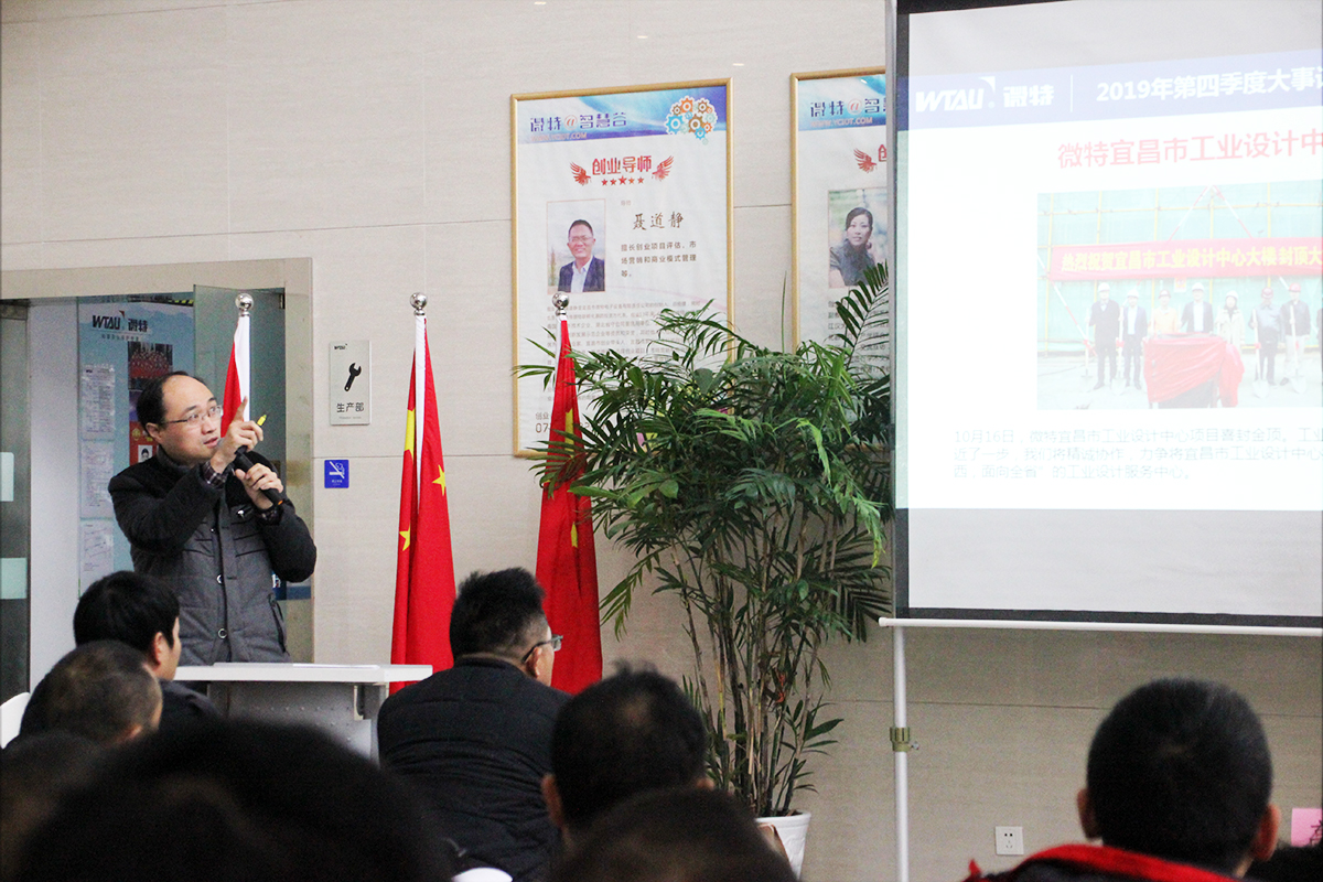 會議中,公司總經(jīng)理高鈺敏帶領(lǐng)與會同事一起回顧了19年第四季度的重要事件。在第四季度中,微特各部門全部順利完成19年全年累積銷售任務(wù),截止12月31日,公司整體大幅超額完成全年任務(wù);聶董參加湖北省委經(jīng)濟(jì)工作會議及省政協(xié)專題會并宣講發(fā)言;微特被國家工信部認(rèn)定為國家級工業(yè)設(shè)計企業(yè)并參加第三屆中國工業(yè)設(shè)計展覽會;微特宜昌市工業(yè)設(shè)計中心項目喜封金頂;10月份,微特參加19年印尼海事展;聶董獲聘為三峽大學(xué)碩士生導(dǎo)師;微特受邀參加中電建協(xié)施工機(jī)械專業(yè)委員會年會,參加中國機(jī)械工程學(xué)會物流工程分會六屆二次理事會,參加印度國際工程機(jī)械與技術(shù)展覽會等多項重要會議。