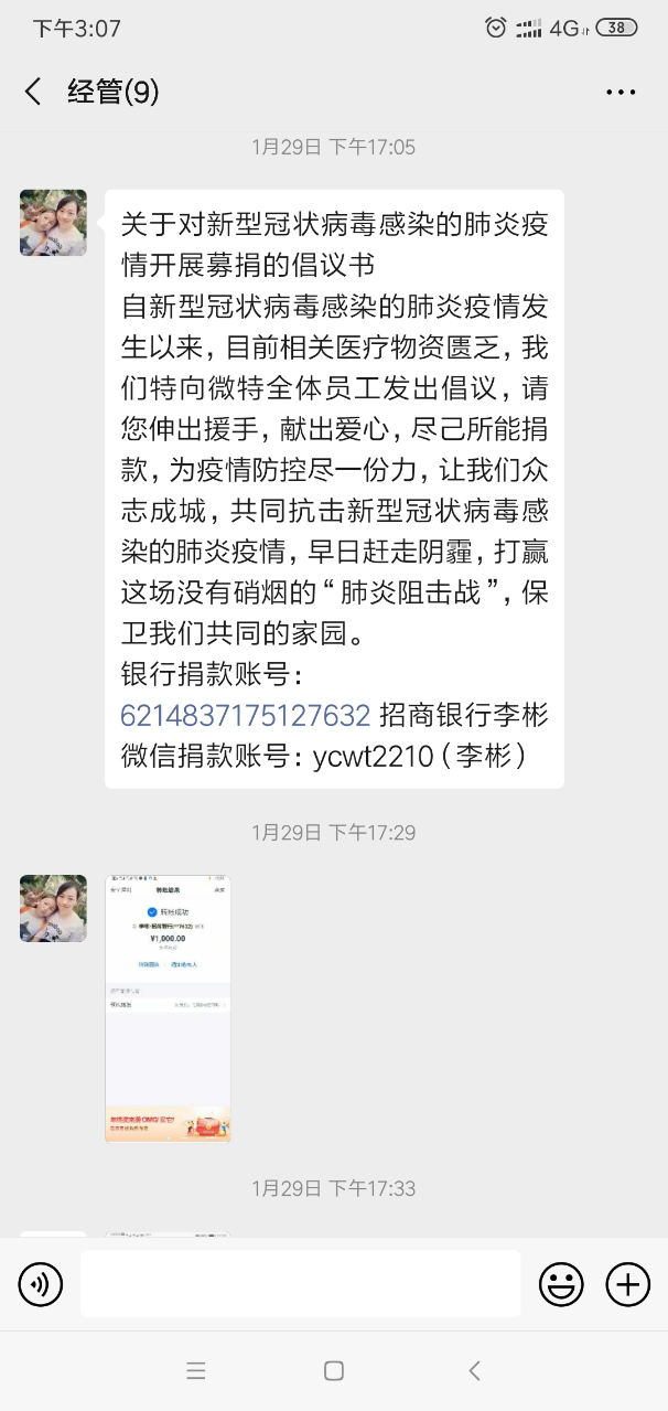 1月29日,微特在公司內部微信群發起《募捐倡議書》,假期中的各地員工紛紛響應慷慨解囊,獻出愛心。