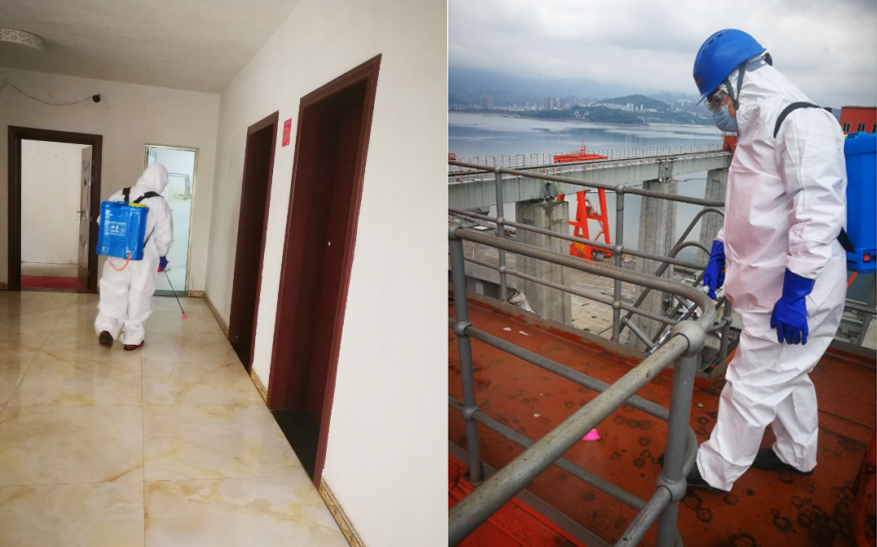 ▲上圖為施工前對生活營地和施工現場設備進行消毒。