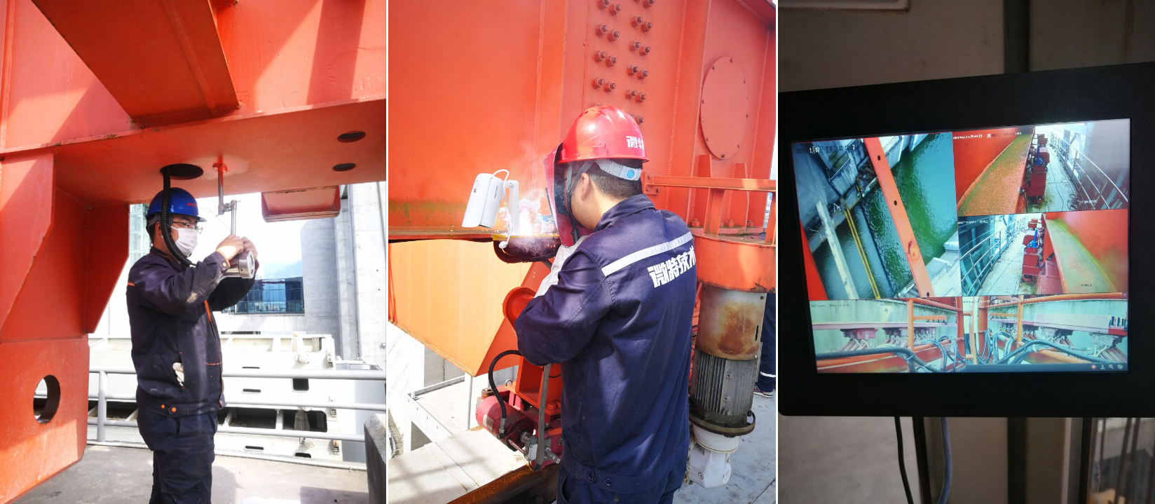 現場復工后,微特技術項目組正式投入井然有序的施工中,本項目施工主要包括上閘首500T橋機和300T橋機、下閘首160T橋機電纜卷筒控制方式、抓梁穿、退銷應急回路、應急泵站一體化改造、增加視頻圖像監控、橋機潤滑系統改造、橋機滑觸線更換、軌道檢測等。