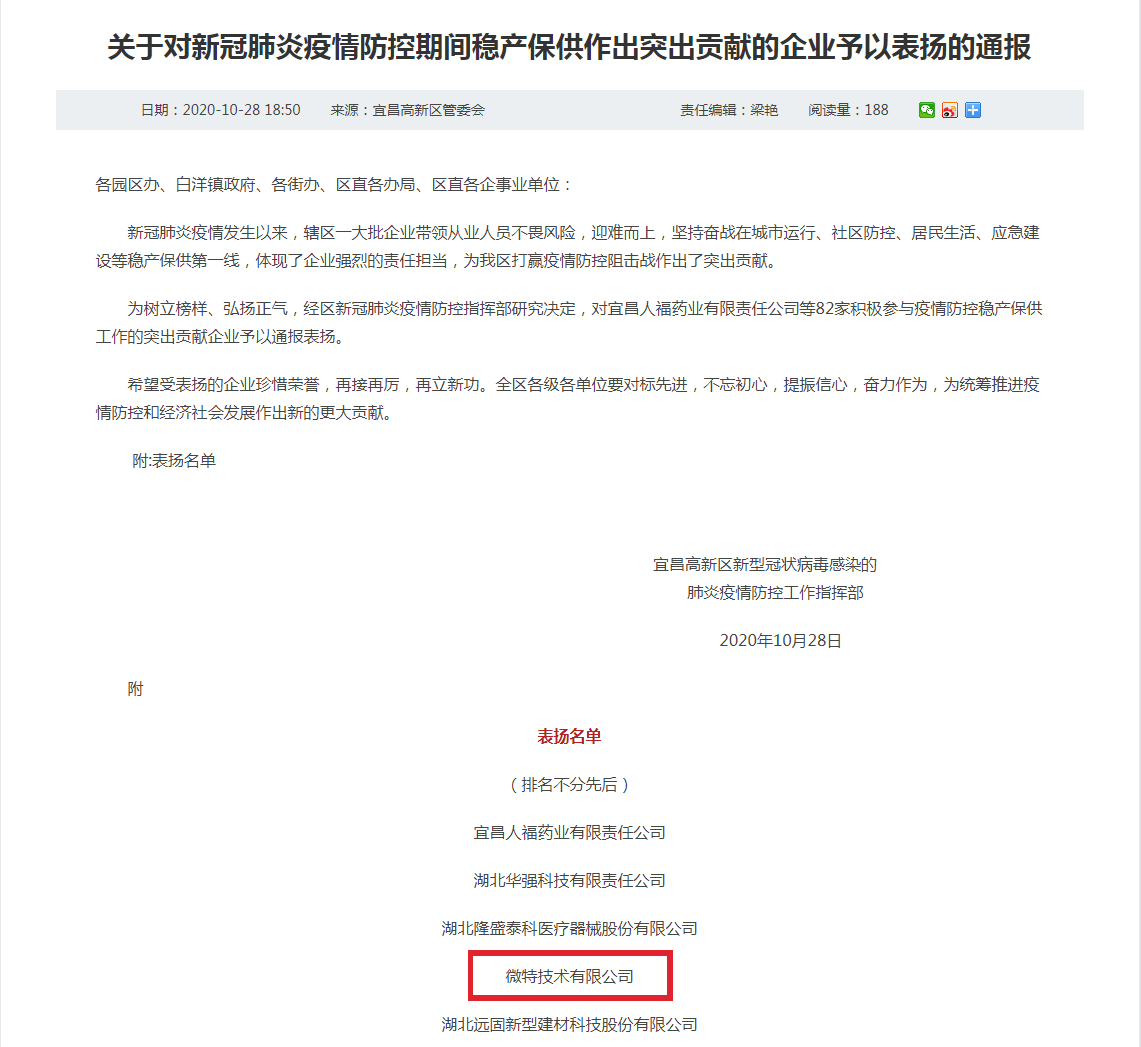 近期,宜昌高新區新型冠狀病毒感染的肺炎疫情防控工作指揮部發布了《關于對新冠肺炎疫情防控期間穩產保供作出突出貢獻的企業予以表揚的通報》,微特技術有限公司位列表揚名單。
