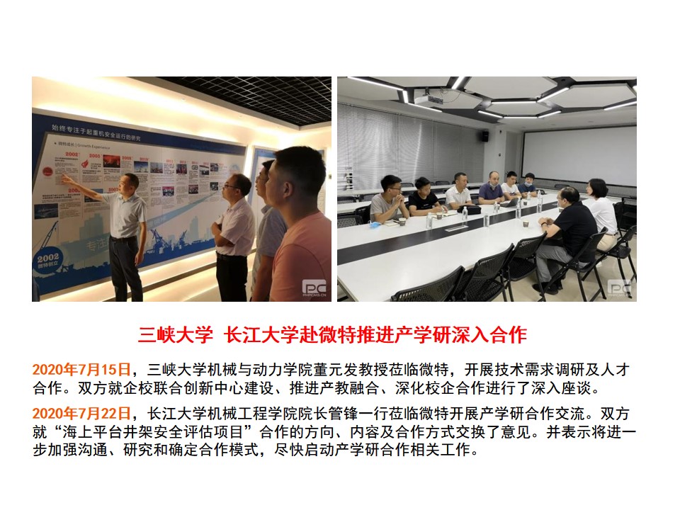 在這特殊的一年里,微特人攻堅克難完成全球規模最大、技術難度最高的三峽升船機的閘首橋機可靠性提高項目,為三峽升船機順利復航提供保障;微特人敢為人先承接定制化攀鋼起重機智能運維系統、振華重工卸船機稱重系統等重大項目,貼身為一流鋼鐵船舶企業服務;微特人開拓進取與中水七局、中建四局等企業合作研發起重機運行關鍵技術項目取得重大突破;微特人勤勉努力不斷深化與全球最大石油生產公司沙特 Aramco、全球頂級起重機品牌DEMAG、Liebherr之間的合作,成果豐碩。