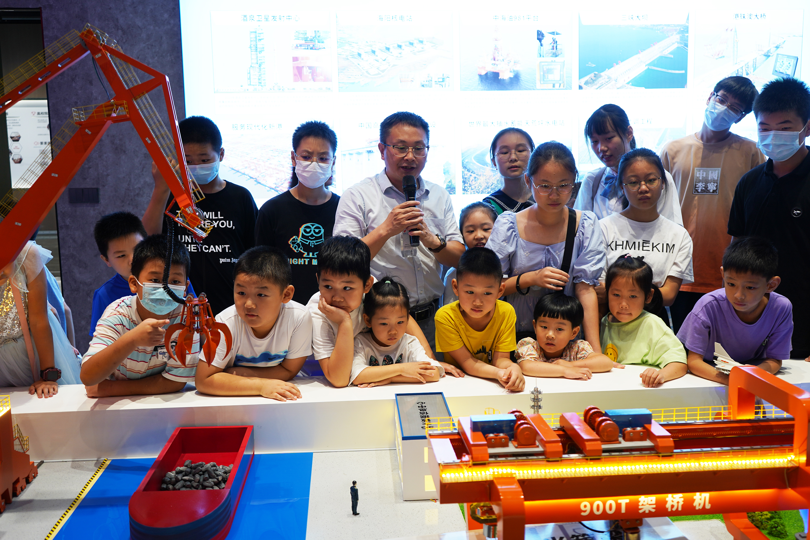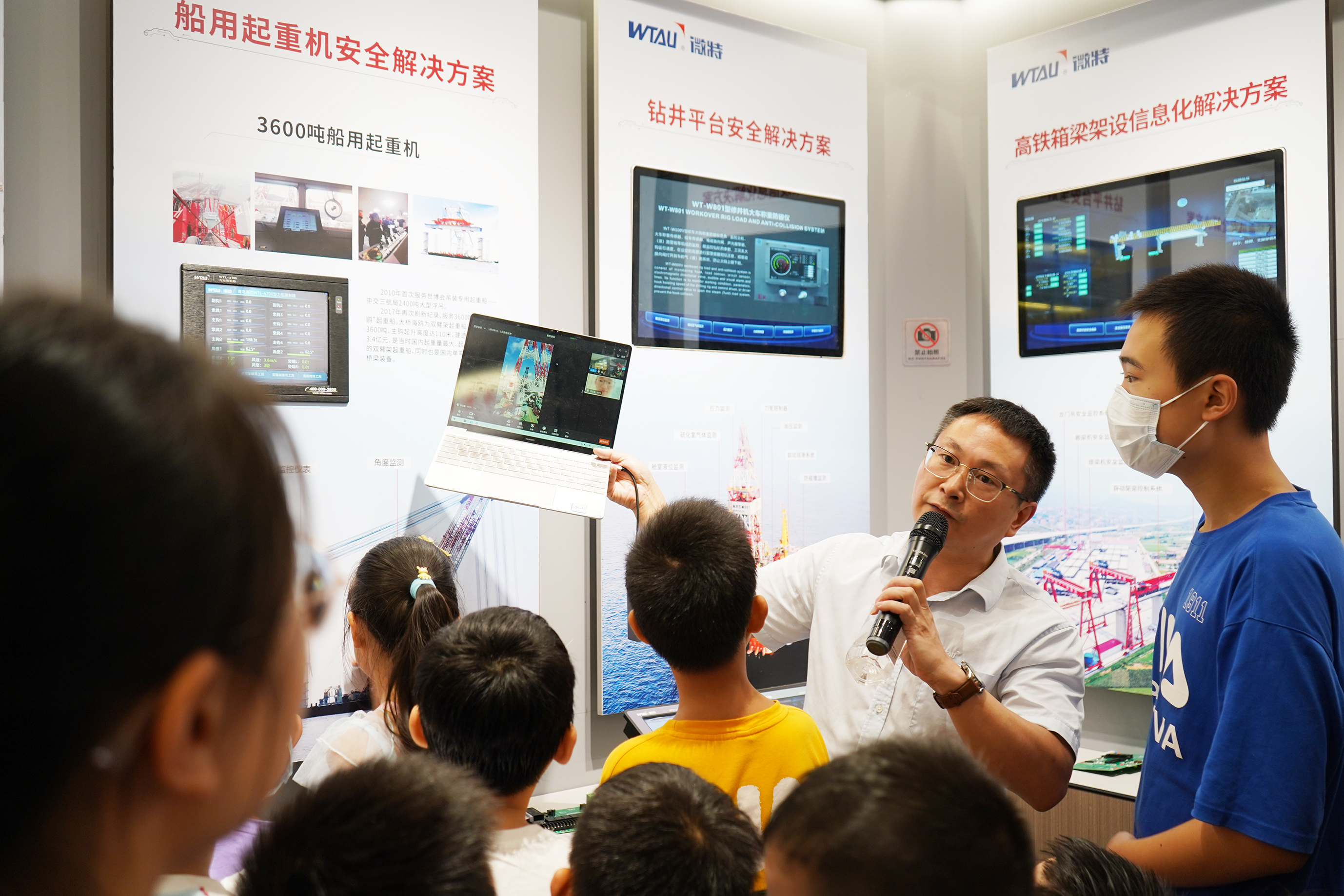 在現場參觀的過程中小朋友們通過微特研發的智能監控系統,與正在中鐵大橋局承建的世界首座公鐵同層多塔斜拉橋——珠海珠機城際金海大橋項目現場出差的曹工視頻連線并進行互動,這個項目現場的鋼塔吊裝設備“大橋海鷗”號3600噸起重船所配裝的正是微特智能監控系統。視頻中曹工的聲音一響起,現場孩子們一片歡呼雀躍嘰嘰喳喳的說著“太神奇了”,這也激起孩子們的好奇心,各種奇思妙想接踵而至。
