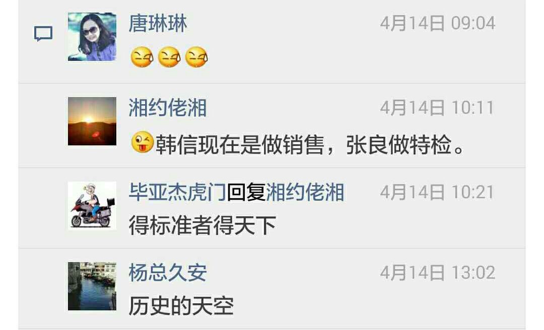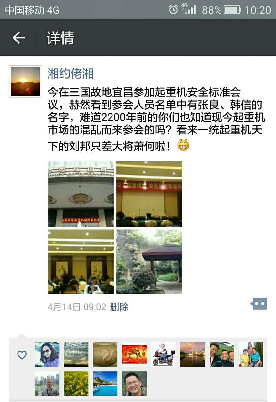 為了紀念這一“歷史性“時刻,天津起重的唐總在其4月13日的微信上也發表了感想,原文摘抄如下:“今在三國故地宜昌參加起重機安全標準會議,赫然看到參會人員名單中有張良、韓信的名字,難道2200年前的你們也知道現今起重機市場的混亂而來參會的嗎?看來一統起重機天下的劉邦只差大將蕭何啦!”唐總此文一出,立馬引來圍觀,點贊者、好奇者、祝福者引爆其朋友圈,著實火了一把,且看微信截圖。