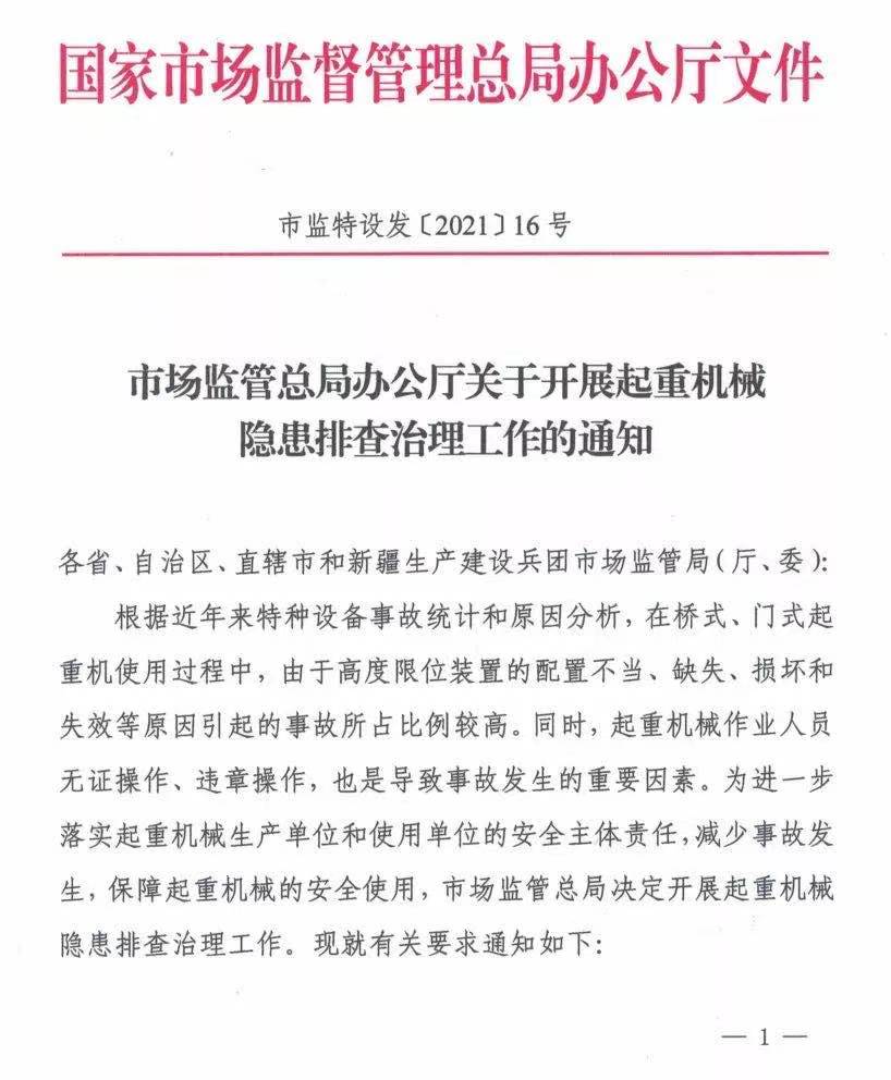 為“消除事故隱患,筑牢安全防線”,國家市場監(jiān)督管理總局辦公廳于3月9日發(fā)布《關(guān)于開展起重機(jī)械隱患排查治理工作的通知》。