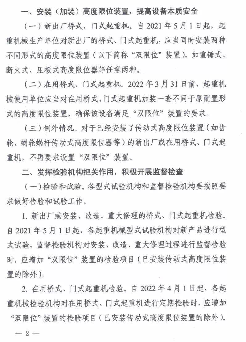 2022年3月31日前,起重機(jī)械使用單位應(yīng)當(dāng)對(duì)在用橋式、門式起重機(jī)加裝一套不同于原配置形式的高度限位裝置,確保該設(shè)備滿足“雙限位”裝置的要求。