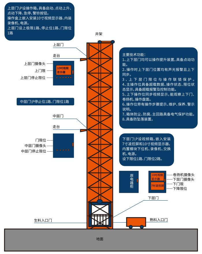 物料提升機是一種固定裝置的機械輸送設備,主要適用于粉狀、顆粒狀及小塊物料的連續垂直提升,設置了斷繩保護安全裝置、停靠安全裝置、緩沖裝置、上下高度及極限限位器、防松繩裝置等安全保護裝置。