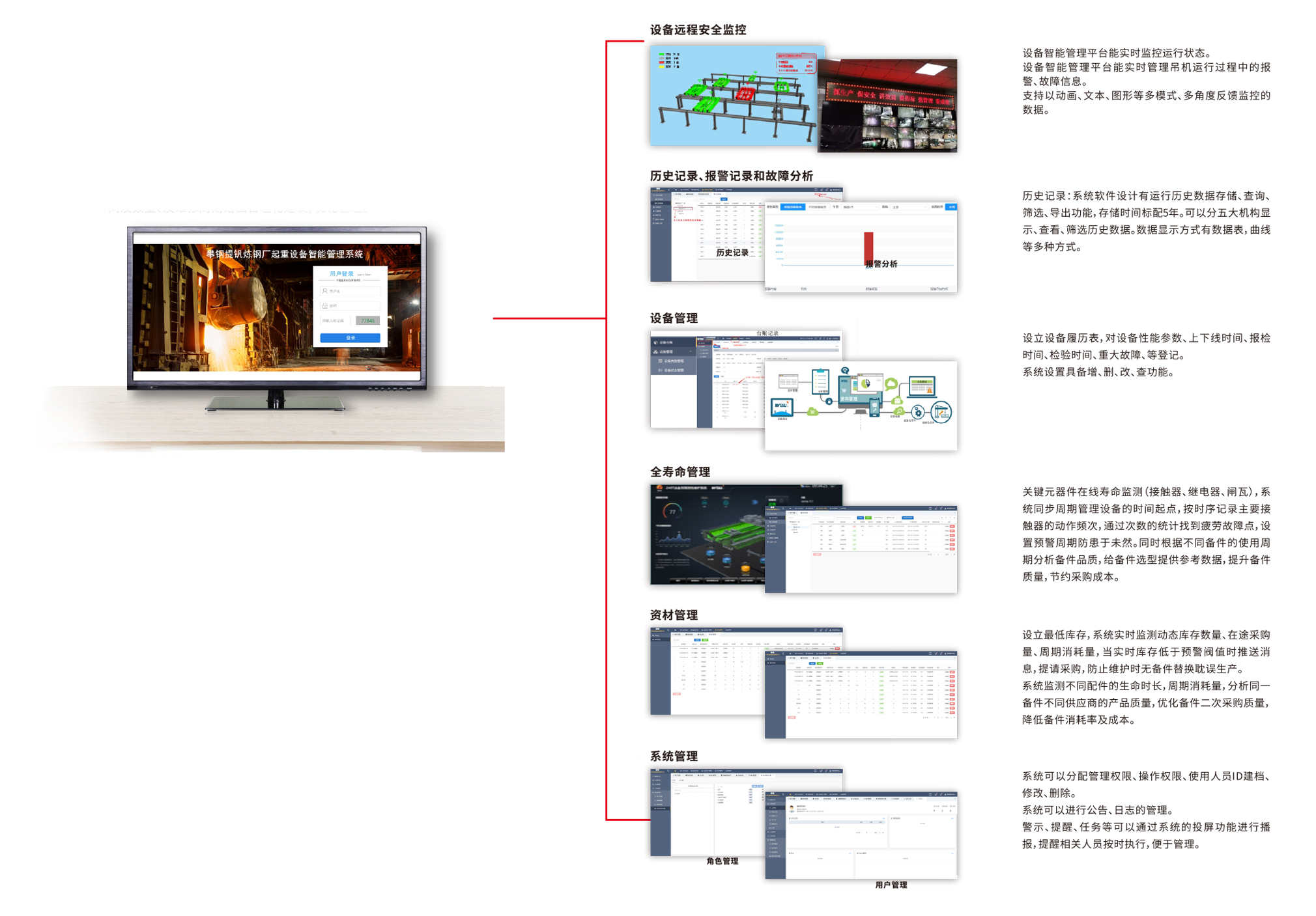 WTCIMS-V2.0系統(tǒng)針對(duì)起重機(jī)運(yùn)行設(shè)計(jì)了設(shè)備基礎(chǔ)信息、設(shè)備運(yùn)行管理、日狀態(tài)監(jiān)控、資材管理、系統(tǒng)管理五大功能模塊,解決起重機(jī)實(shí)時(shí)狀態(tài)監(jiān)測(cè)、資料歸檔、點(diǎn)檢維護(hù)保養(yǎng)、備件周期、隱患趨勢(shì)預(yù)測(cè)等全壽命周期的全過程閉環(huán)管理。