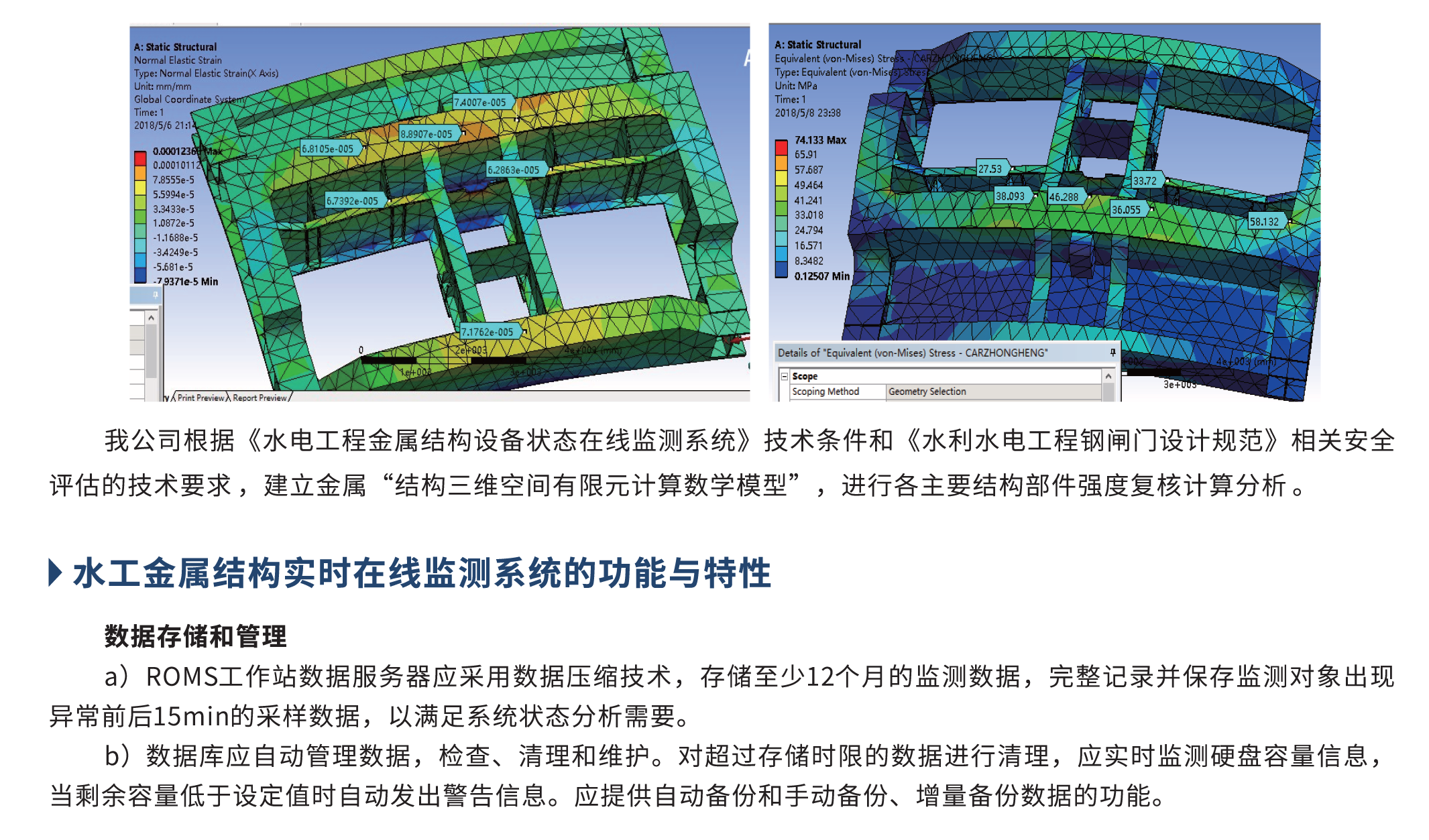 為保證運行安全,以及安全使用壽命評估,閘門實時在線監測數據主要參照《水利水電工程鋼閘門設計規范》 《水工鋼閘門和啟閉機安全檢測技術》《水利水電工程金屬結構報廢標準》規定,預依據閘門設計制造要求對不同閘 門進行有限元計算形成主要監測部位構件驗算結果作為檢驗標準。