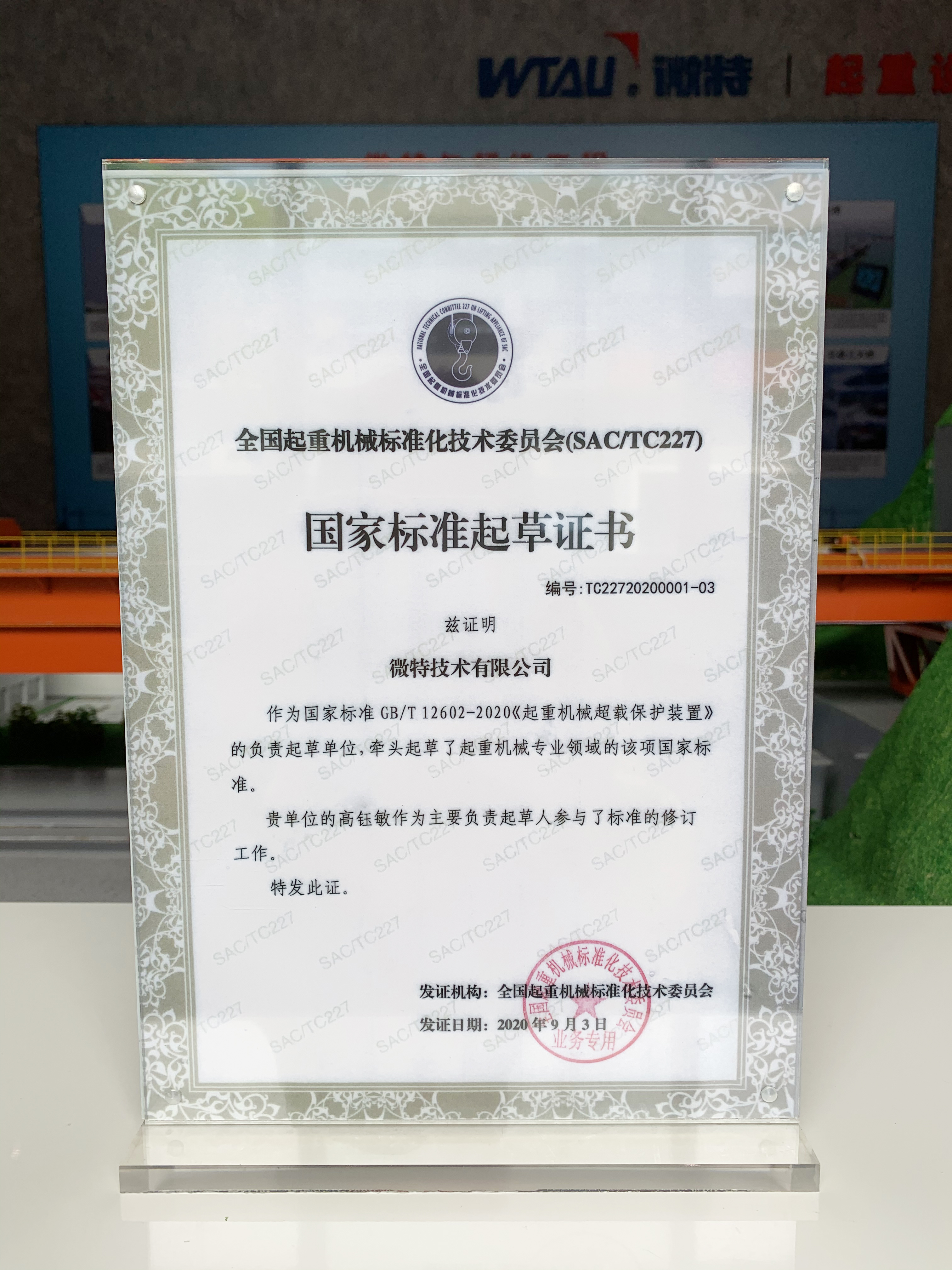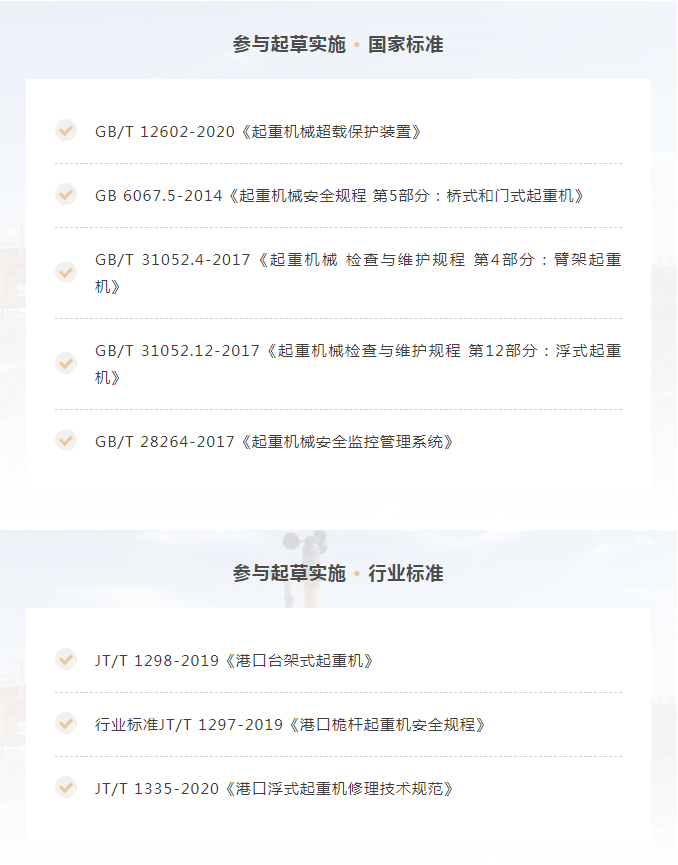 2019年9月微特當(dāng)選全國(guó)起重機(jī)標(biāo)委會(huì)臂架分會(huì)委員會(huì)委員。2020年10月1日由微特牽頭起草的國(guó)家標(biāo)準(zhǔn)GB/T 12602-2020《起重機(jī)械超載保護(hù)裝置》正式實(shí)施,這也是微特參與起草并發(fā)布實(shí)施的第5項(xiàng)國(guó)家標(biāo)準(zhǔn)。截止到目前微特先后參與了20多項(xiàng)國(guó)家標(biāo)準(zhǔn)的起草,其中5項(xiàng)國(guó)家標(biāo)準(zhǔn)及3項(xiàng)行業(yè)標(biāo)準(zhǔn)已頒布實(shí)施。